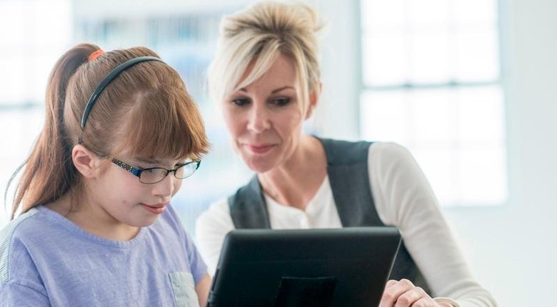 A woman and a child read on a tablet.